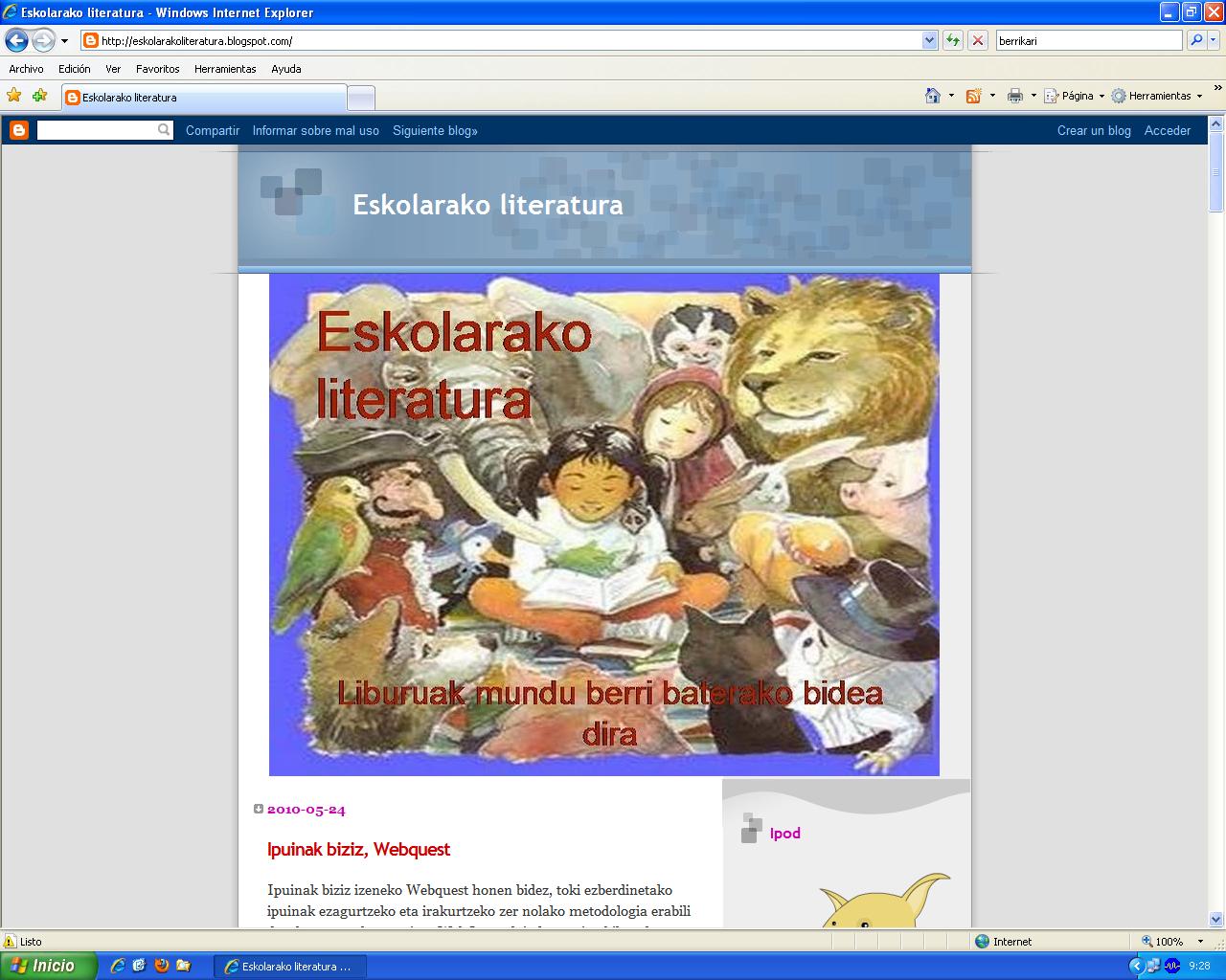 Lehenengo blogarekin hasiko naiz, bere izena Eskolarako Literatura da, bertan nik lantzen dudan gaia bera aurkituko duzue baina ikuspuntu ezberdin batekin. Ona izaten da, literaturari buruz ikuspuntu anitzak edukitzea, ezin gara gure ideietan bakarrik zentratu. Blog honetan, ikasleentza interesgarriak diren kontakizunak aurkituko dituzue, beste blogekin eta orrialdeekin lotura interesanteak aurkituko dituzue bertan, beti umea eta literatura kontuan hartuz.